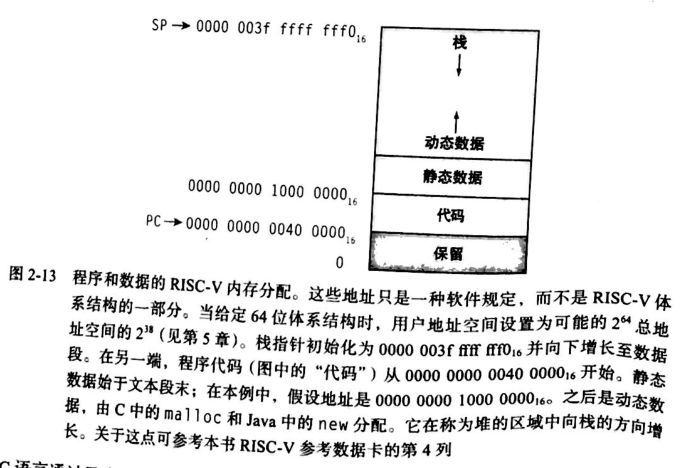 栈由内存高端开始向下增长。内存低端的第一部分是保留的。之后是RISC-V机器代码的第一部分,通常称为代码段(text segment)。代码段之上的代码为静态数据段(static data segment),是存储常量和其他静态变量的空间。尽管数组通常具有固定长度因而能和静态数据段很好的匹配,但是类似链表这样的数据结构通常会再生命期内增加或者缩短。这类数据结构对应的段习惯上称为堆(heap),一般再存储器中放在静态数据段之后,注意,这种分配允许栈和堆相互增长,从而再两个段此消彼长的过程中达到内存的高效使用。