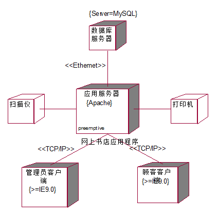 - 部署图主要用来说明系统的软件和硬件是如何分布的。在 上书店系统中,显然需要一台应用服务器保存和运行整个Web应用程序,同时需要一台数据库服务器进行数据管理。此外,还有很多客户端通过互联 与应用服务器相连,这样作为顾客用户的会员和访客可以通过 络访问应用服务器获取相应的服务。管理员客户端也可以通过互联 或局域 与应用服务器连接进行业务管理。应用服务器还可以与打印机或扫描仪等设备相连。