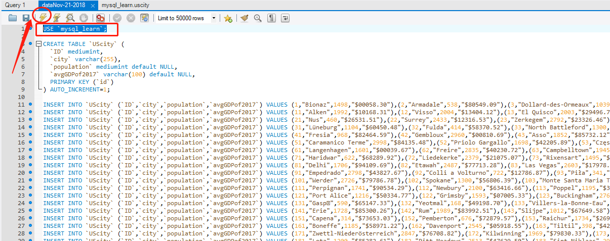 由于该 SQL 脚本并没有指定使用哪个数据库,所以,在打开的 SQL 窗口前面要加上一句” USE `mysql_learn`; “(mysql_learn可以为其他你现存的任一数据库名称)。