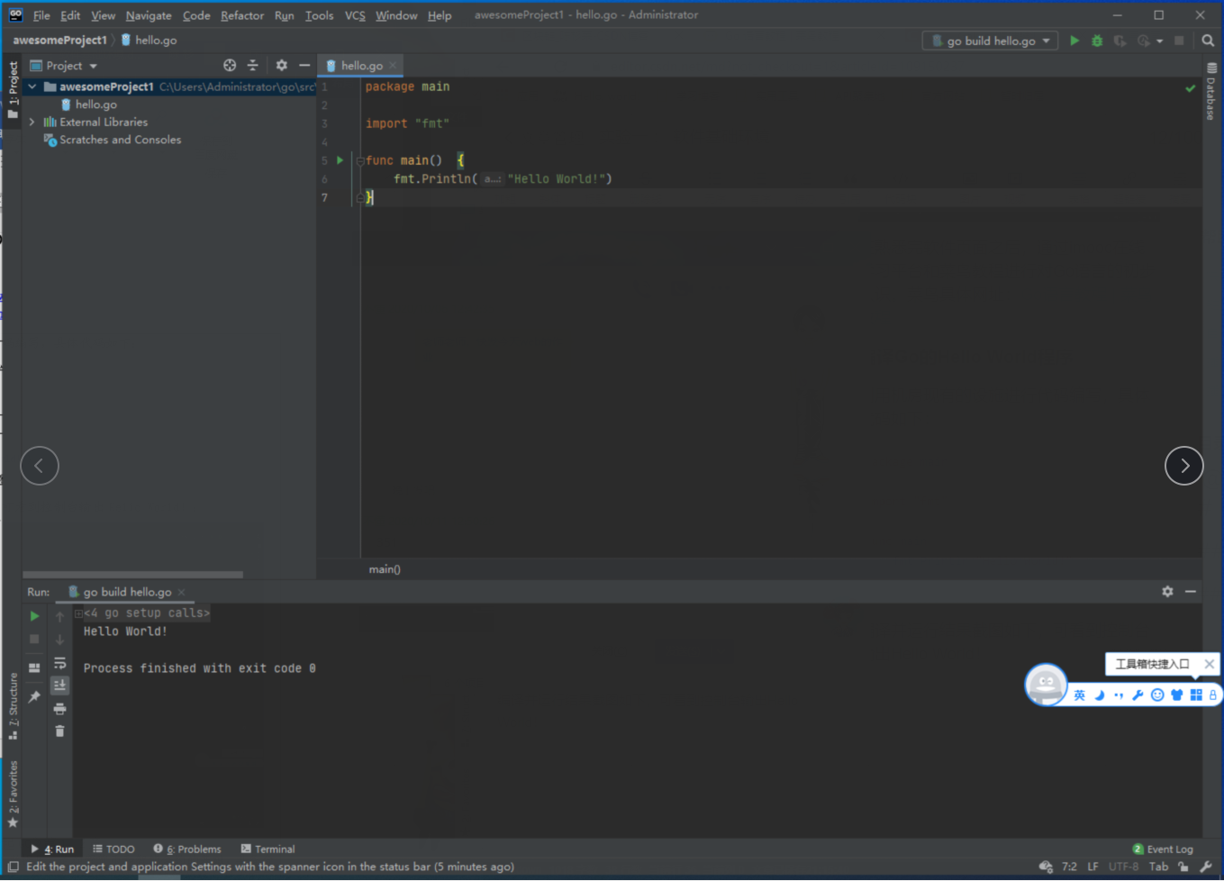 编译并运行结果截图如下,可看到控制台输出Hello World!