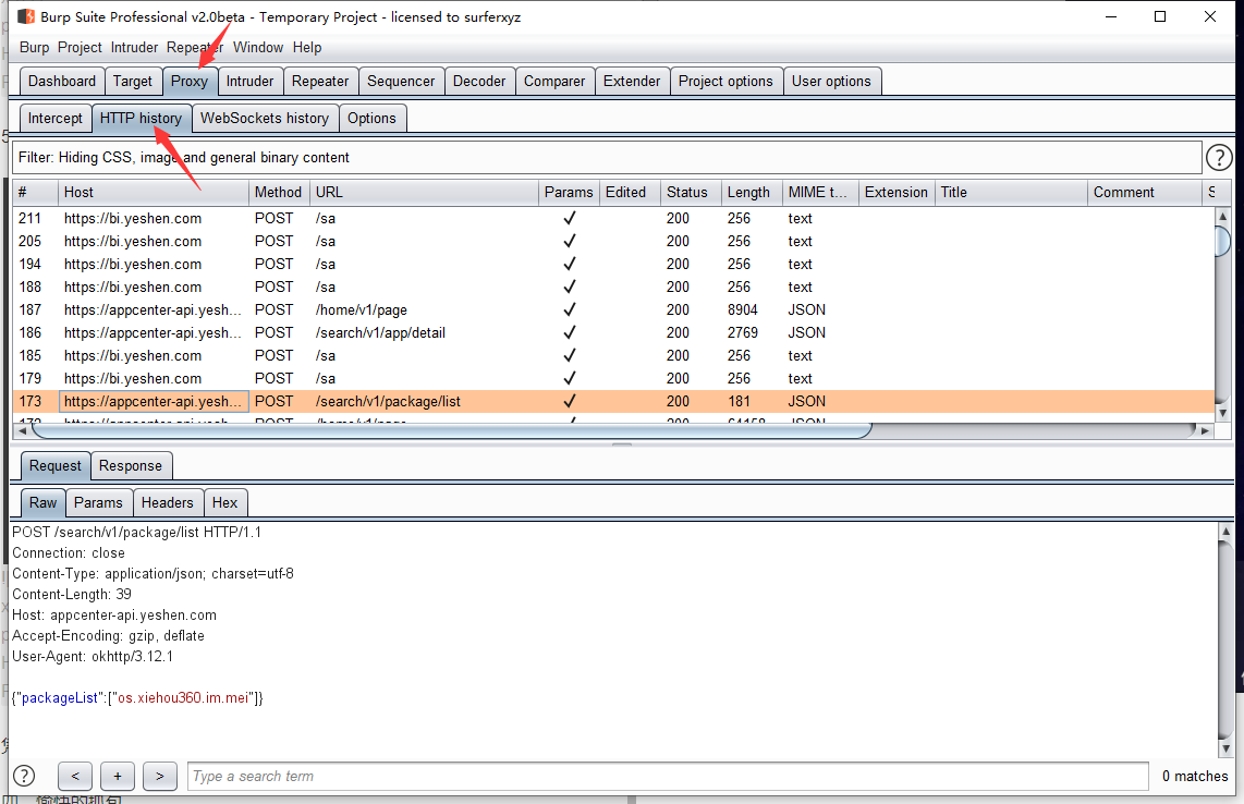随便打开一个应用,即可在burpsuite中看到抓到的数据包