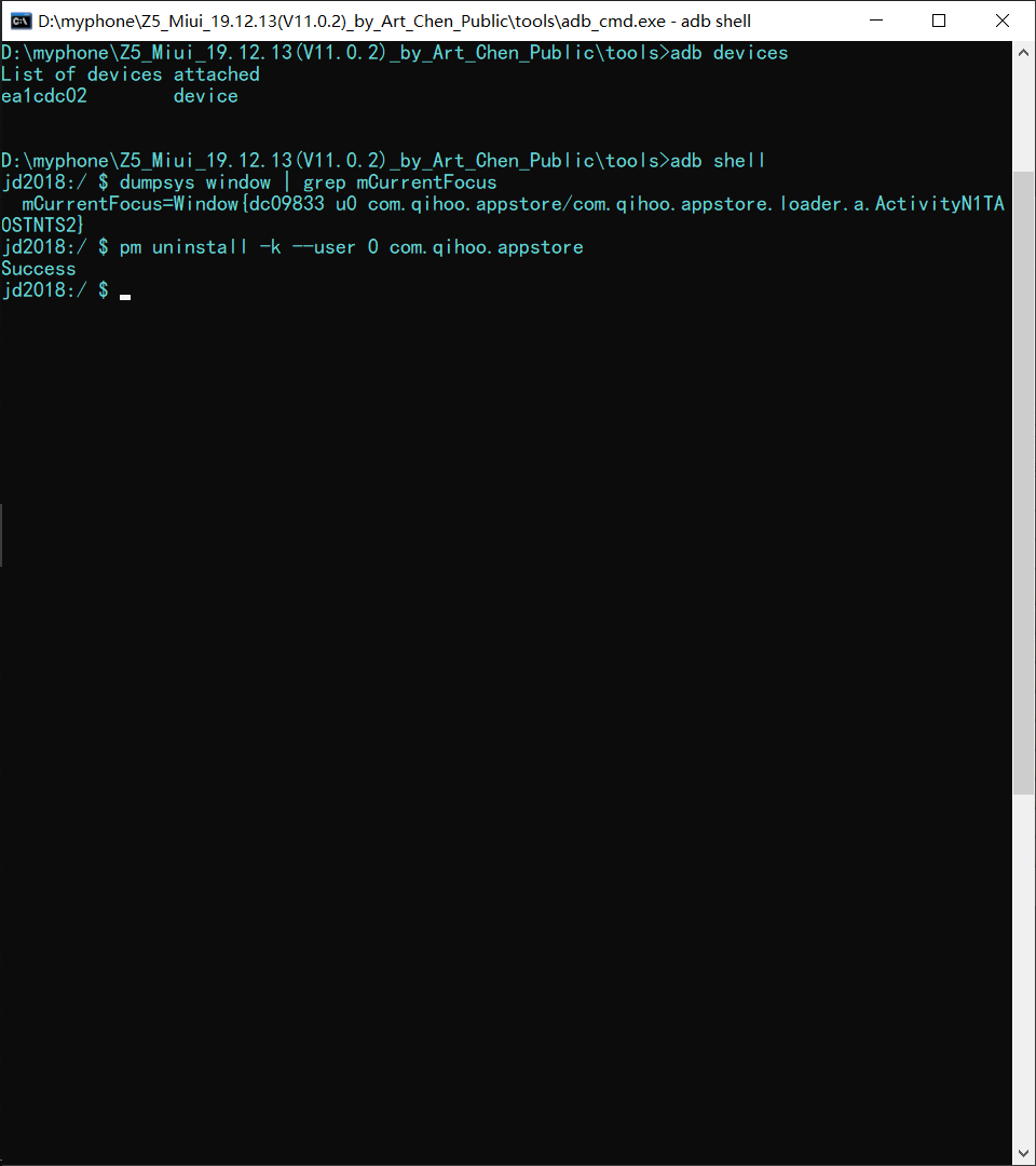 命令 pm uninstall -k –user 0 com.qihoo.appstore(其他的软件注意改下包名)
