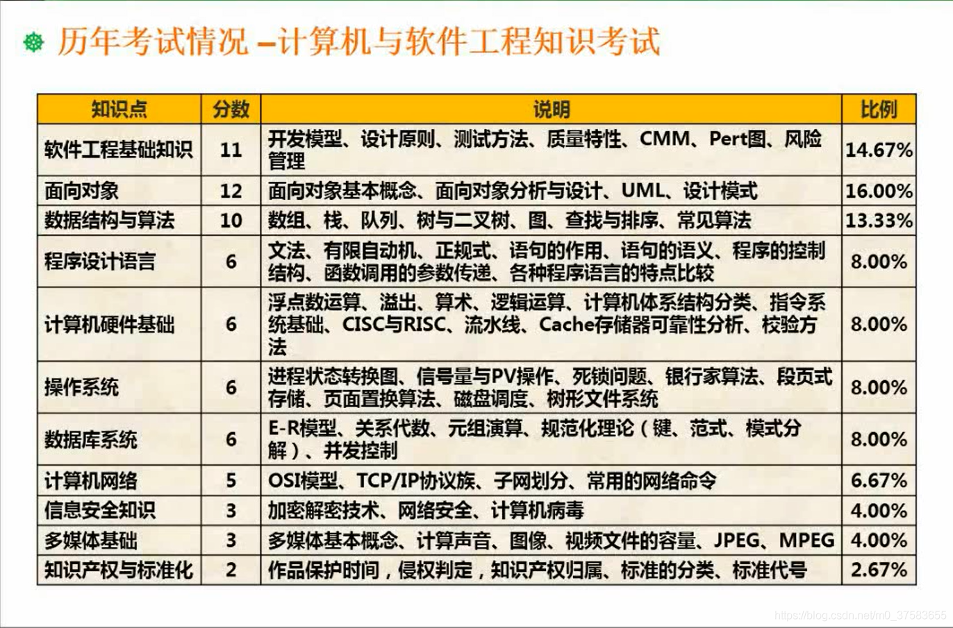 | 软件工程基础知识 | 开发模型,设计原则,测试方法,质量特性,CMM,pert图,甘特图等 |