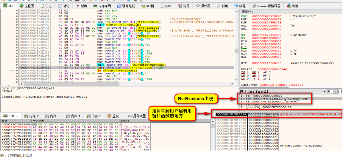 通过上诉步骤得到WinRAR的类名为RarReminder后,使用x64dbg工具载入WinRAR.exe。在命令的地方使用断点命令【bp CreateWindowExW】,在CreateWindowEx函数断下断点。F9运行到各个断点时观察广告窗口弹出的状态变化。