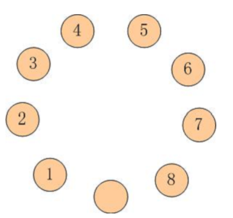 也可以再用点力,越过一个相邻的蚱蜢跳到空盘中。请你计算一下,如果要使得蚱蜢们的队形改为按照逆时针排列,