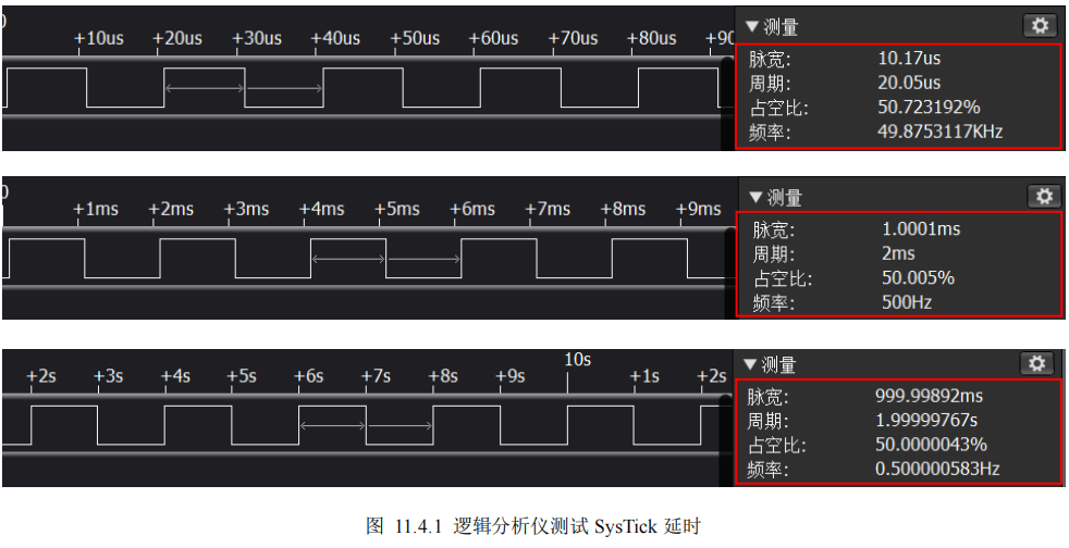 通过LED展示SysTick的延时结果不够严谨,有条件的读者可以使用示波器或逻辑分析仪测试LED灯对应引脚(PB0,在J21_3引出)的翻转时间,如图 11.4.1 所示,分别修改延时时间10us、1ms、1s后逻辑分析仪测量值。