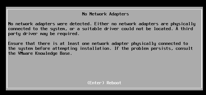我最开始是采用方式二进行的,需要准备额外一台电脑和一个移动U盘,并且需要在 上下载vmware exis6.5 的镜像文件(iso)将移动U盘做成系统启动盘(具体软件 上很多例如:大白菜等)。然后在设备启动时狂按F10/F2(不同类型的电脑按键不一样, 上可查的)进入bios界面,选择你的u盘做为启动盘,之后就是慢慢等待的过程。导致我不采用方式二的原因是在我安装的时候,一直提示找不到 络适配器,见下图: