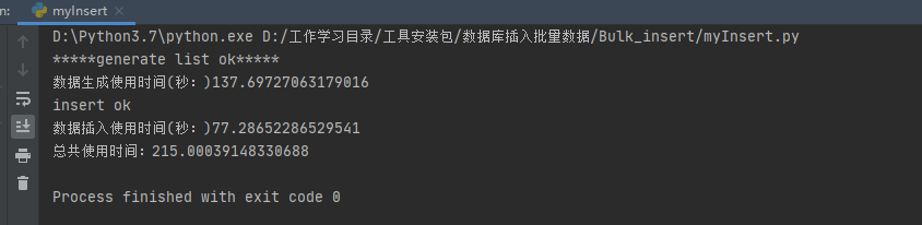 下面是我生成数据所使用的时间,大多数时间浪费在了生成数据上面,毕竟要做一些处理,百万数据插入数据库用例一分钟十七秒