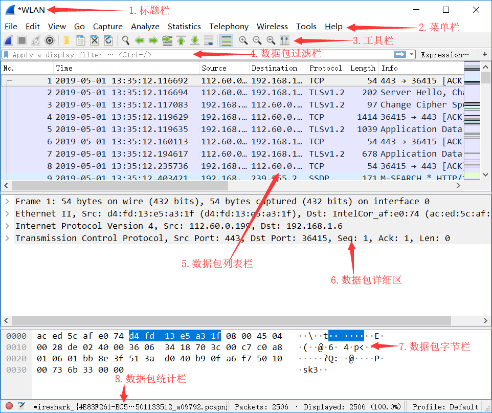 - 数据包统计区 (总共抓了多少,有多大,丢包量等等)