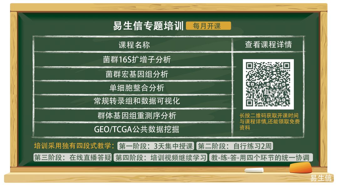 福利公告:为了响应学员的学习需求,经过易生信培训团队的讨论筹备,现决定安排扩增子16S分析、宏基因组、转录组的线上/线下同时开课。 名参加线上直播课的老师可在1年内选择参加同课程的一次线下课 。期待和大家的线上线下会晤。