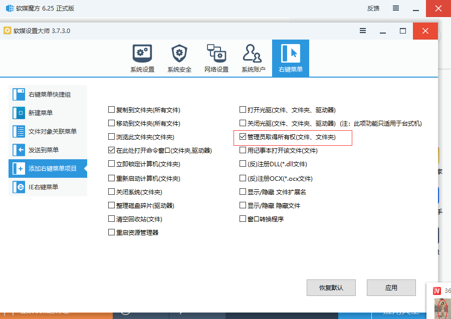 复制时可能出现无管理员权限的问题,解决方法:简单的办法是去下载软件,譬如软媒魔方,功能搜索:管理员取得所有权,里面有可以增添鼠标右键获取管理员权限的功能,接着再去右键点击SysWOW64文件夹获取管理员权限,就可以复制粘贴了!