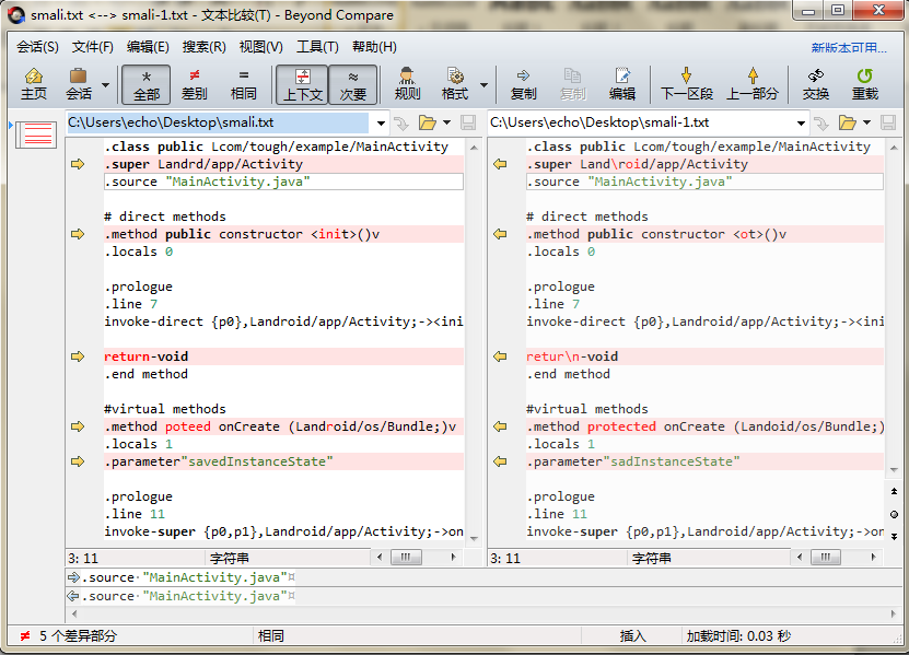 完成文件格式的切换,再次回到比较会话操作界面,如图图例所示,文本比较左右窗格中的Java源代码文件之间的重要差异内容以不同颜色标注显示,查看方便。