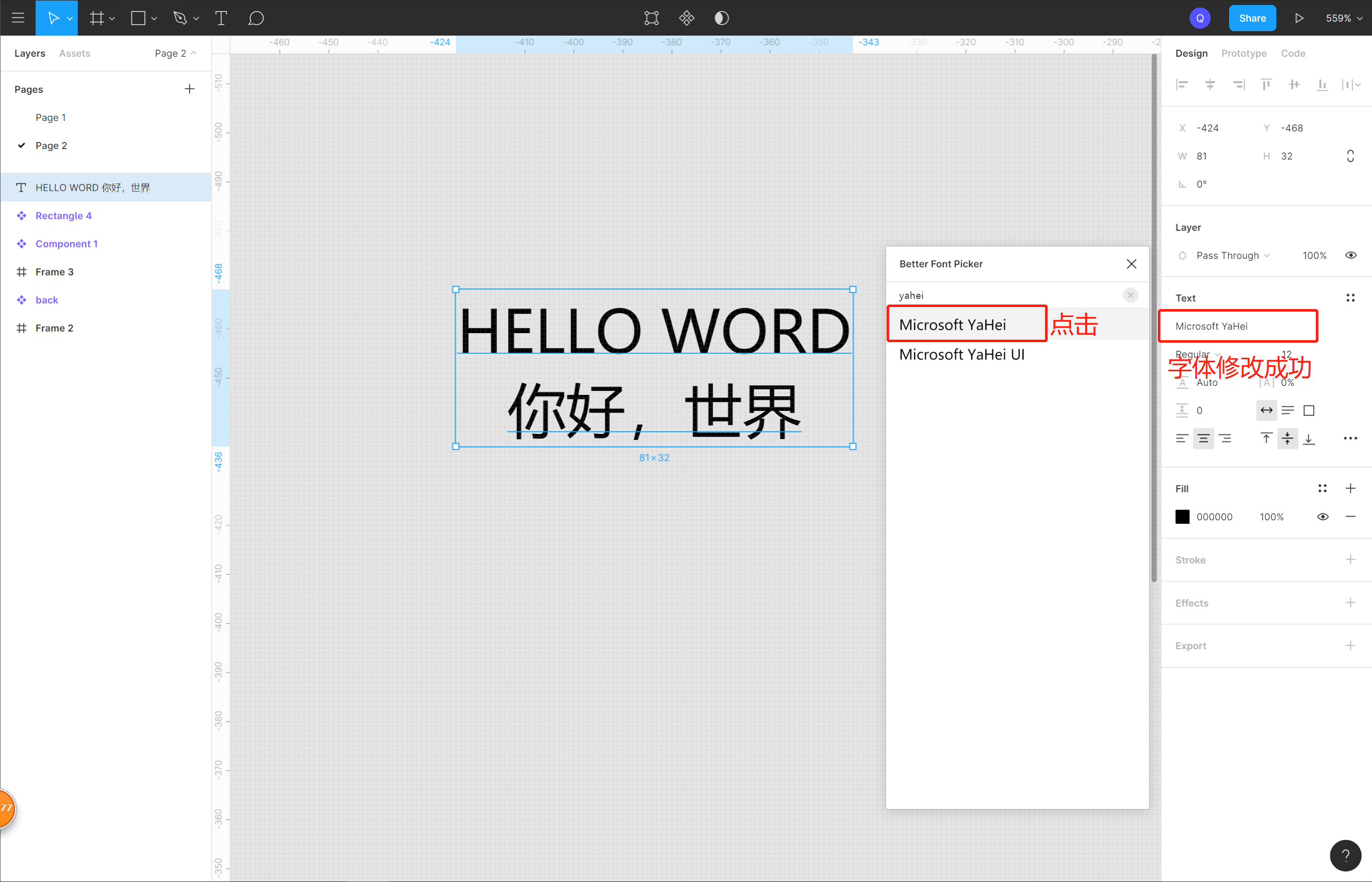 Figma中,如果你要对中文文本选择设置其它的字体,那真的太难了,因为figma中的字体名称显示几乎都不是中文的,比如“微软雅黑”,显示的是“Microsoft Yahei”,如你一开始并不知道,那就非常难找的,因为他不支持拿中间或尾部名字来模糊查询,如输入“雅黑、yahei、微软雅黑、微软”等都是找不到字体的,只能输入“Microsoft”才行,当然也可以输入逐个输入M I C R O…这样去逐步缩小范围,这还是比较简单的例子,如果是那种特殊命名的字体、艺术字等等,嘿嘿,你懂的。