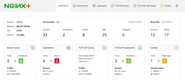 为了帮助用户尽快发现问题,NGINX Plus增加了应用程序体检功能,会 告经常重复出现的问题。NGINX Plus还具备session draining特性,会在已有任务完成前阻止新连接,以及慢启动容量,从而让恢复的服务器在负载均衡集群中达到应有的速度。使用得当的情况下,健康体检会在问题显著影响用户体验之前帮你定位问题,而session draining和慢启动则让你替换服务器时不影响感知的性能和在线时间。这张图展示了NGINX Plus内置的实时活动监控的控制板,涵盖了服务器、TCP连接和缓存。