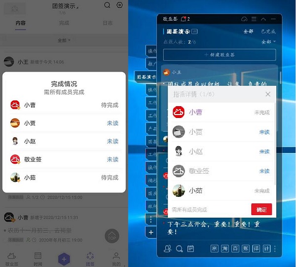 而且在任务完结后,团签成员们还能对指派给自己的任务团签标记已完成,以便团签创建者可以通过团签的指派详情获取每个成员的动态信息,以便及时进行下一步的日程安排。