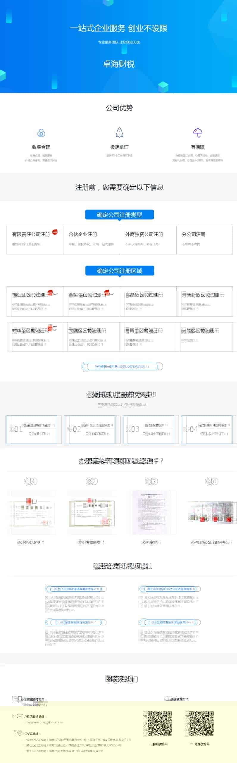 卓海公司成立十多年来,一直用心服务于小微企业主,公司不断整合各类人才和资源,卓海企业集团下设有财税公司,知识产权公司,科技公司,企业孵化器公司,人力资源公司,传媒公司,卓海电商企业服务 等多家分支机构和职能部门,努力打造成为一站式企业服务优质提供商。服务涉及:代理各类工商注册、变更、注销,各类资质代办,项目申 ,财税服务,企业孵化,企业住所托管服务,R商标注册、变更、转让、续展,版权申请、专利申请,产品质检,产品条码, 站建设,小程序商城订制开发,品牌营销,各类知名电商平台入驻代办等一站式企业服务。