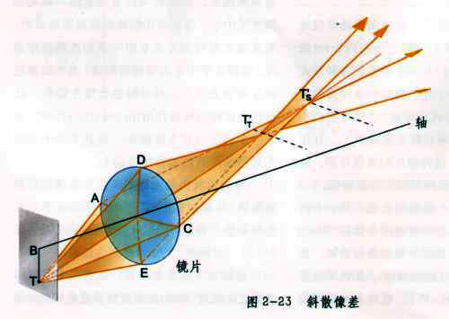 当点光源以一个很细的光束,从一个斜角穿过镜片而形成点光源的两条像线,此即为斜散像差。当戴镜者倾斜时,光线是斜穿过球面镜片的边缘部,其效果就像通过柱镜片视物一样。所以,戴镜者倾斜视物时便会产生模糊。