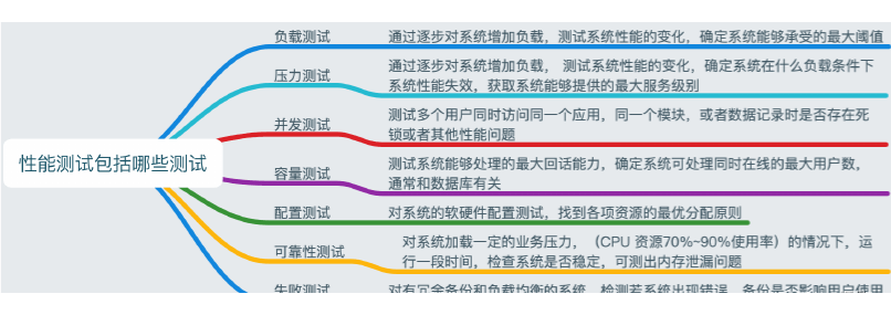 性能测试包括:基准测试、负载测试、压?测试、并发测试、容量测试、可靠性测试(稳定性测试)、配置测试、失败测试。