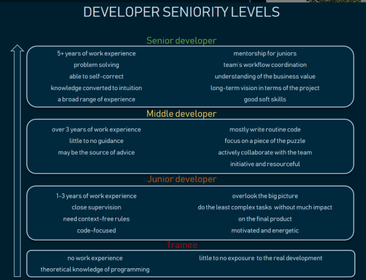 具有深厚专业知识和详尽经验的开发人员,使他们可以指导同龄人,被称为资深人士。 此外,高级开发人员在他们所支持的业务领域中也很有知识。 他们的能力甚至可以扩展以帮助市场营销和整体业务发展。 高级开发人员将始终在考虑自己在做什么,从而为业务带来多少收益。