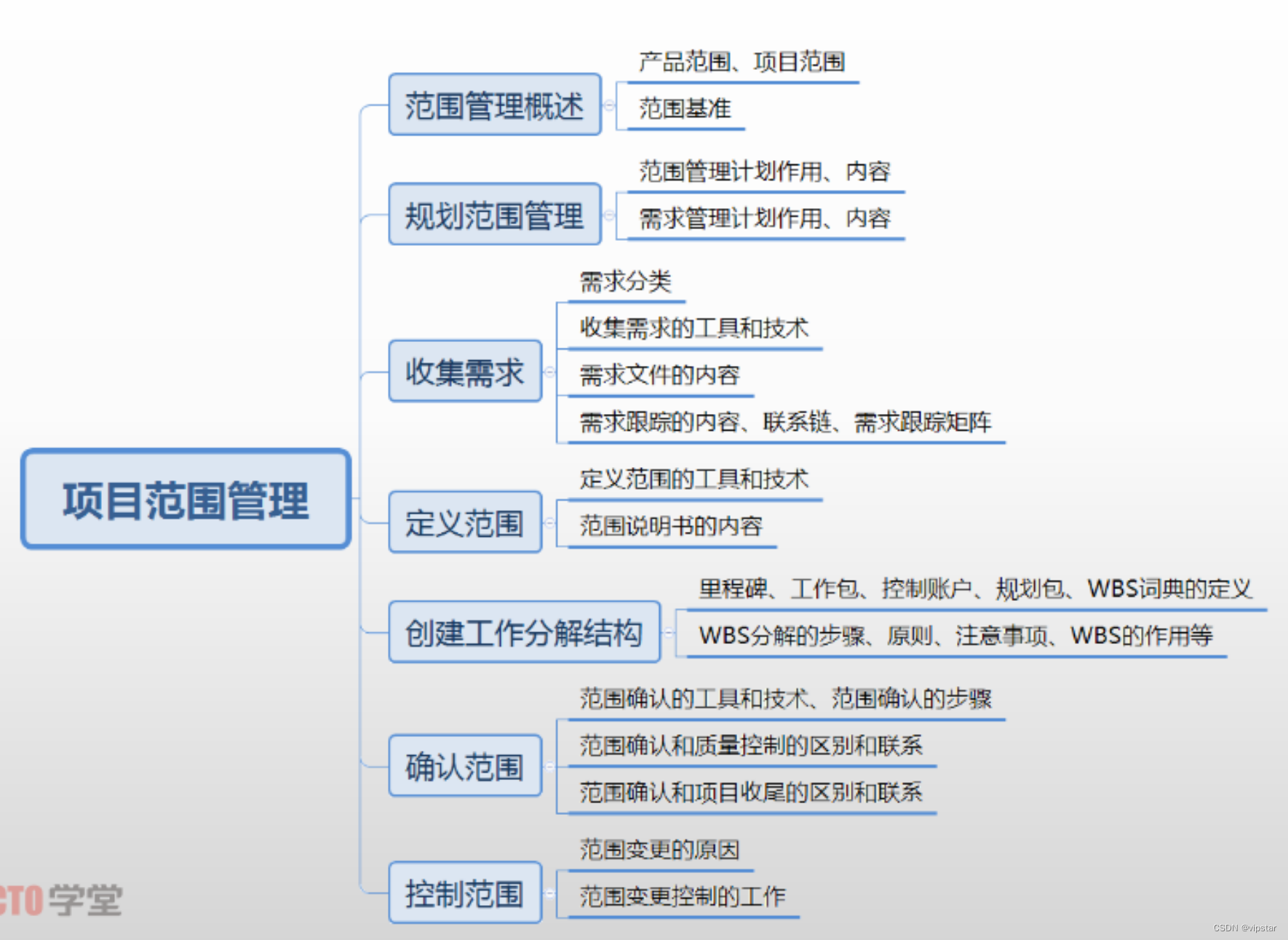 - 控制范围 :监督项目和产品的范围状态、管理范围基准变更