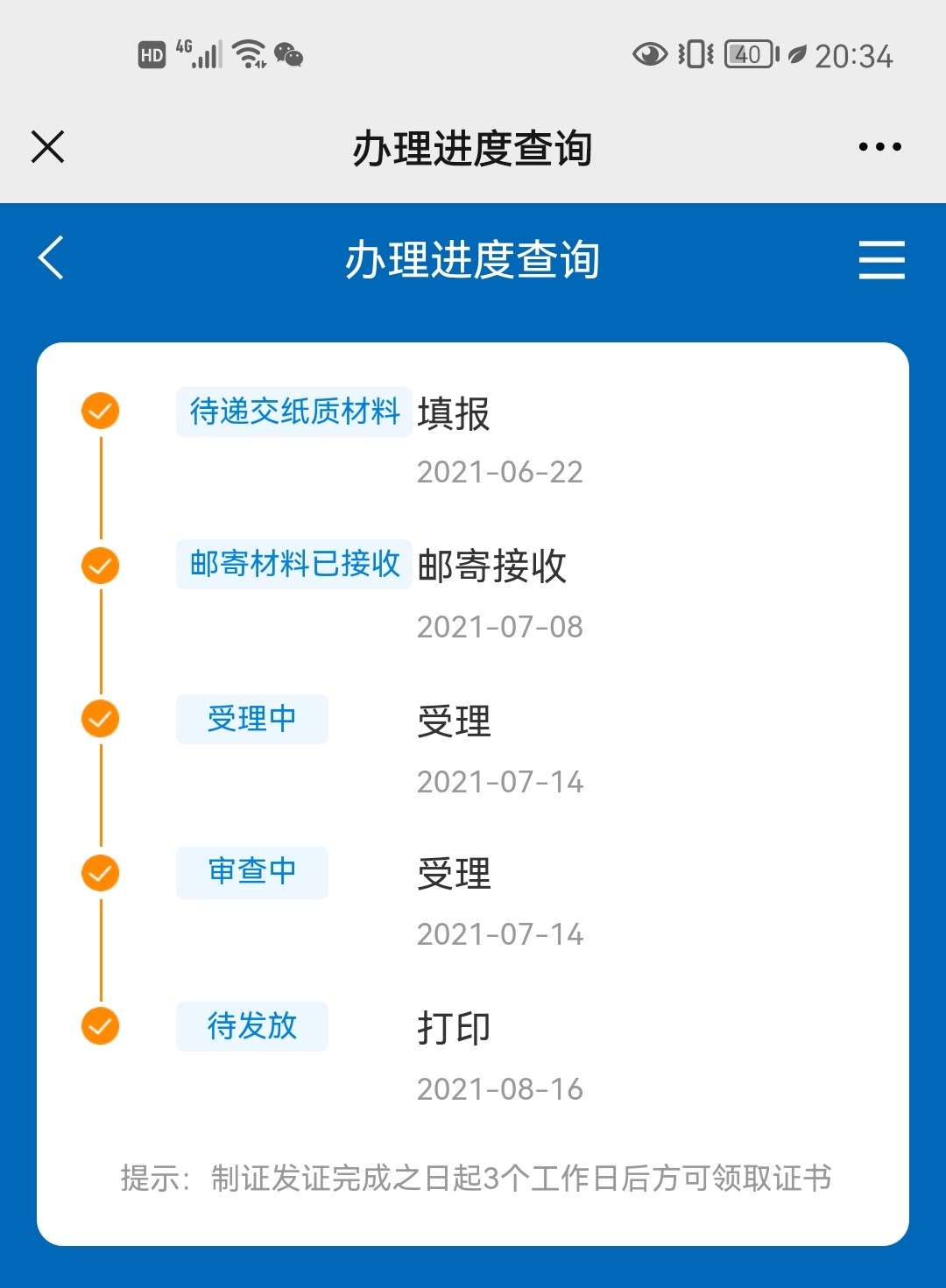进度 时间 上完成信息填 2021年6月22日 纸质材料寄出 2021年6月24日 纸质材料到达北京 2021年6月27日 邮寄材料已接收 2021年7月08日 受理中 2021年7月14日 审查中 2021年7月14日 待发放 2021年8月16日 已发放 2021年8月20日 收到证书 2021年8月23日 声明:本站部分文章及图片源自用户投稿,如本站任何资料有侵权请您尽早请联系jinwei@zod.com.cn进行处理,非常感谢!