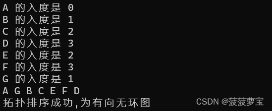 再在AOV 中选择一个入度为0的顶点输出,然后删除此顶点,将其连接的节点的入度减一直至输出所有顶点或者AOV 中不存在入度为0的顶点为止。